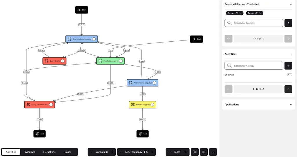 You receive visual process maps (exportable to BPMN 2.0), dashboards with performance metrics, and variant overviews — showing where processes branch, slow down, or deviate.