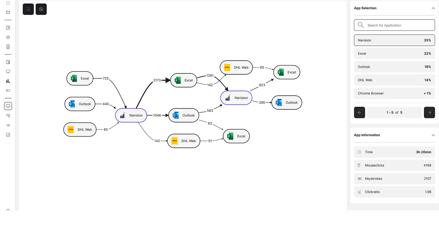 Paxray is installed as a lightweight client runs in the background. It records task-level workflow data — like clicks, opened tools, and switchovers between applications — fully anonymized and without capturing screens, keystrokes, or personal content. Employees can work as usual — Paxray observes processes, not people.