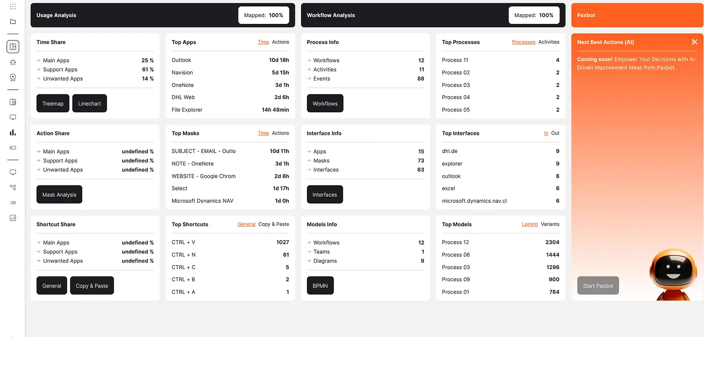 The collected data flows into the Paxray analytics engine. There, advanced algorithms and AI reconstruct actual end-to-end workflows by stitching together thousands of small actions into clear process paths.