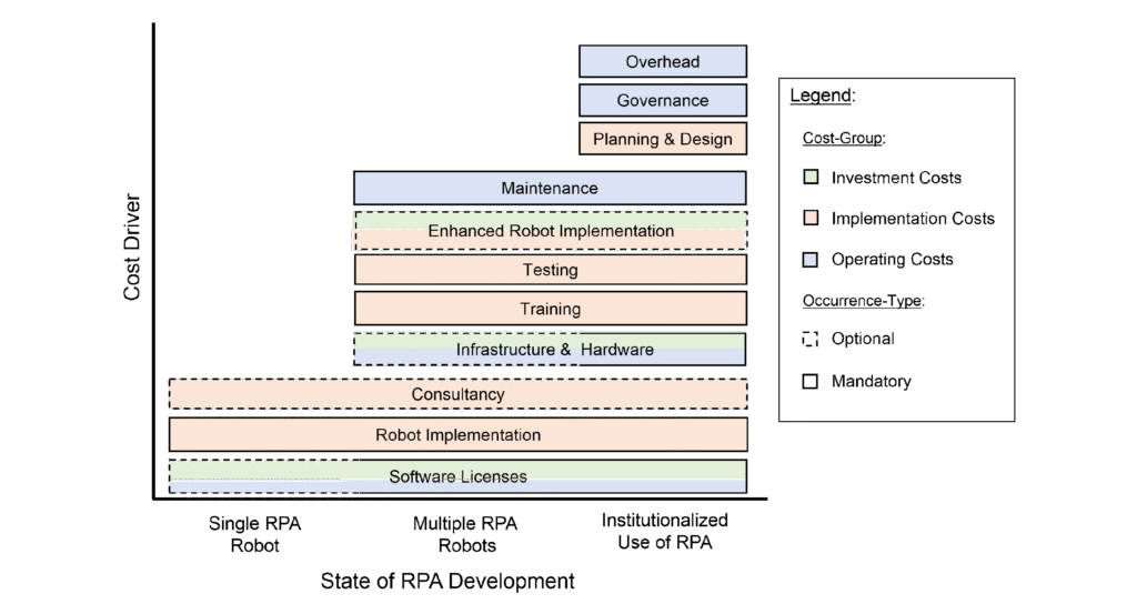 Here, our in-depth study of existing enterprise RPA implementations has revealed, that many cost drivers must be considered when scaling RPA implementations. These include not only the cost of operating software robots, but also the costs of implementation and investment. Likewise, we were able to differentiate between mandatory and optional costs for each type of scaling. In doing so, we found that while a single RPA robot implementation does not lead to many cost drivers, increasing the number of implementations also implies specific cost types such as infrastructure and hardware or maintenance. In addition, some cost drivers become mandatory due to software licensing costs. Ultimately, institutionalized use of RPA will also introduce unexpected costs that may include governance costs. Our Research was published at the RPA Forum of the 20th International Conference on Business Process Management 2021 and was awarded with the Best Paper Award .